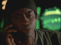 We rejoin our heroes on earth outside the noble VW Bus. Paris is trying to use Rain's car stereo to repair his communicator that was damaged when Dunbar used The Weapon™ against them. He's unsuccessful, but they figure out that they could use the radio dish at the observatory to send a signal to Voyager. Actually, they eventually figure out how not only to use the dish to contact Voyager, but route the signal through local cellular towers to enable them to use a common cell phone (humongous in 1996) to talk freely with Voyager. I must say that's pretty damned impressive considering how often your average cell phone drops a call today, much less in 1996!