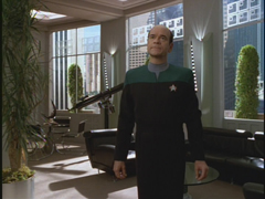 Back on Voyager, Janeway and crew are discussing their options. They again affirm that Henry is a "genius," but that that will only get him into the future. It won't prevent him from destroying the solar system in the 29th century. Tuvok gives them a call, and they decide to enlist Rain's help to get the timeship, since she's employed by Henry.