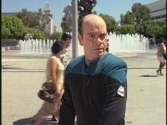 Henry then tells The Doctor that he's coming with him. The Doctor points out that he can't go where there aren't holographic emitters. Henry just laughs. You see, Voyager (the show) has decided to rip off Red Dwarf even further than they already have. Henry has a "mobile emitter" that The Doctor can wear on his arm to go anywhere. Yes, we now have Voyager's version of the Light Bee. As we'll learn, by the 29th century we'll have perpetual motion technology, since this thing is described as "self-sustaining." Maybe it's like one of those self-winding watches that's powered by the movement of your wrist. I guess I shouldn't be too upset by this, though. With this miraculous invention, I get to see a lot more of The Doctor, who was almost reason enough to watch Voyager. Almost.