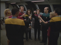 Anyway, he can't send them home to the Alpha Quadrant because of his Prime Directive and all, so they have to go back to the Delta Quadrant. Bummer for them. I guess the words "Prime Directive" mean pretty much the same thing anywhere you go: "We are directed primarily to do whatever involves the least amount of effort on our part, especially if lifting the proverbial finger would be immensely compassionate and benefit a large number of people."